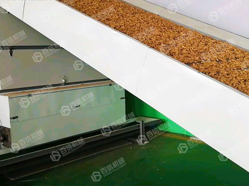 花生烘干機(jī)將需要干燥的花生放置在輸送帶上,經(jīng)均料器后物料被平鋪在網(wǎng)帶上,輸送至烘干機(jī)內(nèi)部,在烘干機(jī)箱體內(nèi)呈“s"型逐層翻轉(zhuǎn)、下落,烘干后的花生從出料口流出。經(jīng)過轉(zhuǎn)換后的熱風(fēng)從烘干機(jī)底部進(jìn)入,熱氣流自下而上穿過每一層網(wǎng)帶和其上的物料層,逐層烘干,熱量交換均勻、充分,生產(chǎn)效率高,干燥品質(zhì)好。